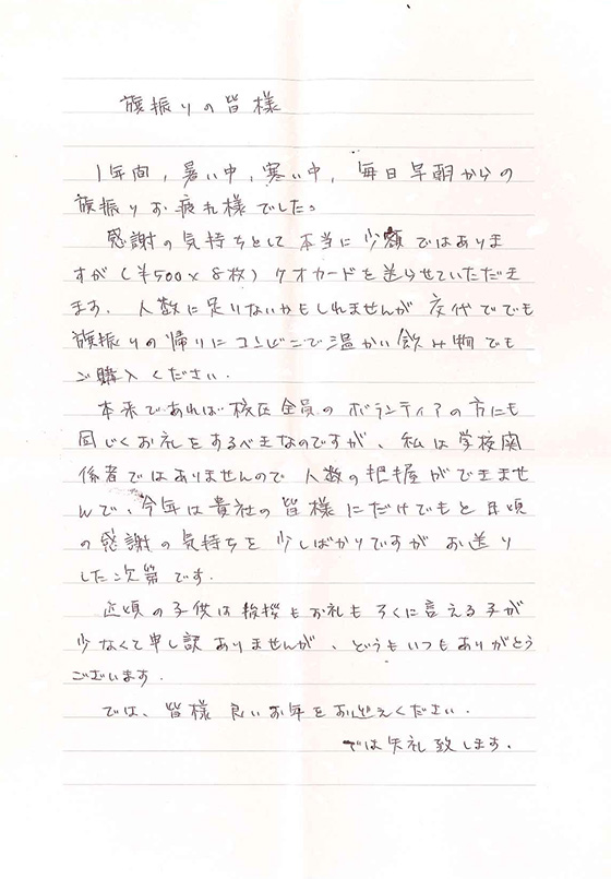 社会貢献活動 『旗振り』ボランティアの10周年記念 Tweet 2016.01.16 by 山本エコロジーサービス 0 (株)山本エコロジーサービスは、経営理念の中に『地元地域のご発展に貢献します』という目標を掲げております。 更に従業員ドライバーへの歩行者の目線の教育の一環として約10年以上に渡り会社近隣の歩道でボランティアを行なってきました。 そんな折、こんなお手紙を頂きました。 お名前、住所などは記載がありませんでしたが、社員一同大変感動しました。 地元地域への貢献を形は変わるかもしれませんが、(株)山本エコロジーサービスは全力で取組んで行くことを再認識しました。